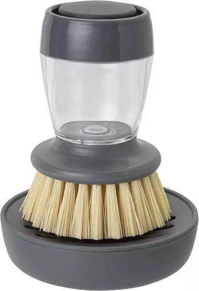 päällä on pumppu, jonka avulla tiskiaineen annostelu sujuu helposti. Tiskiharjan mukana on kätevä alusta, johon ylimääräinen vesi valuu.