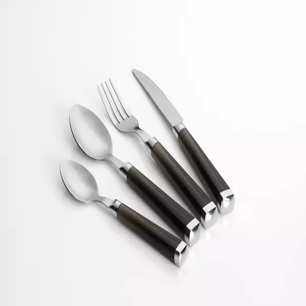 Laadukas 16 osan aterinsetti mustalla korostevärillä. Aterinsettiin sisältyy: - 4 kpl haarukoita - 4 kpl veitsiä - 4 kpl lusikoita - 4 kpl pikkulusikoita