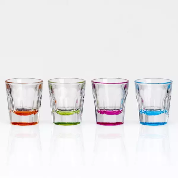 Akryylista valmistetut värikkäät shottilasit.