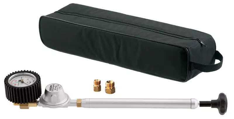 Sisältää: paineenrajoitin, koepainemittari 0-250 mbar laatuluokka 1.0 (paineenkestävä 2.5 bar asti), käsipumppu, kuljetuspussi ja kaksi liitintä G 1/4 lh F