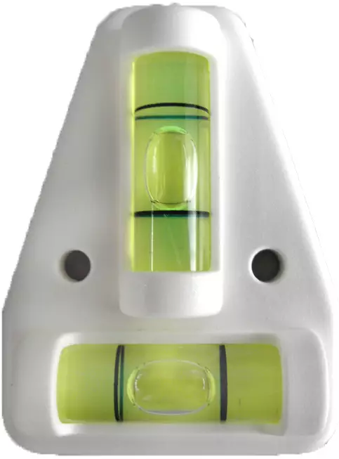 Kahdella ruuvilla tai tarralla kiinnitettävä kolmiovesivaaka matkailuajoneuvon poikittaisen ja pitkittäisen kallistuman tarkistamiseen