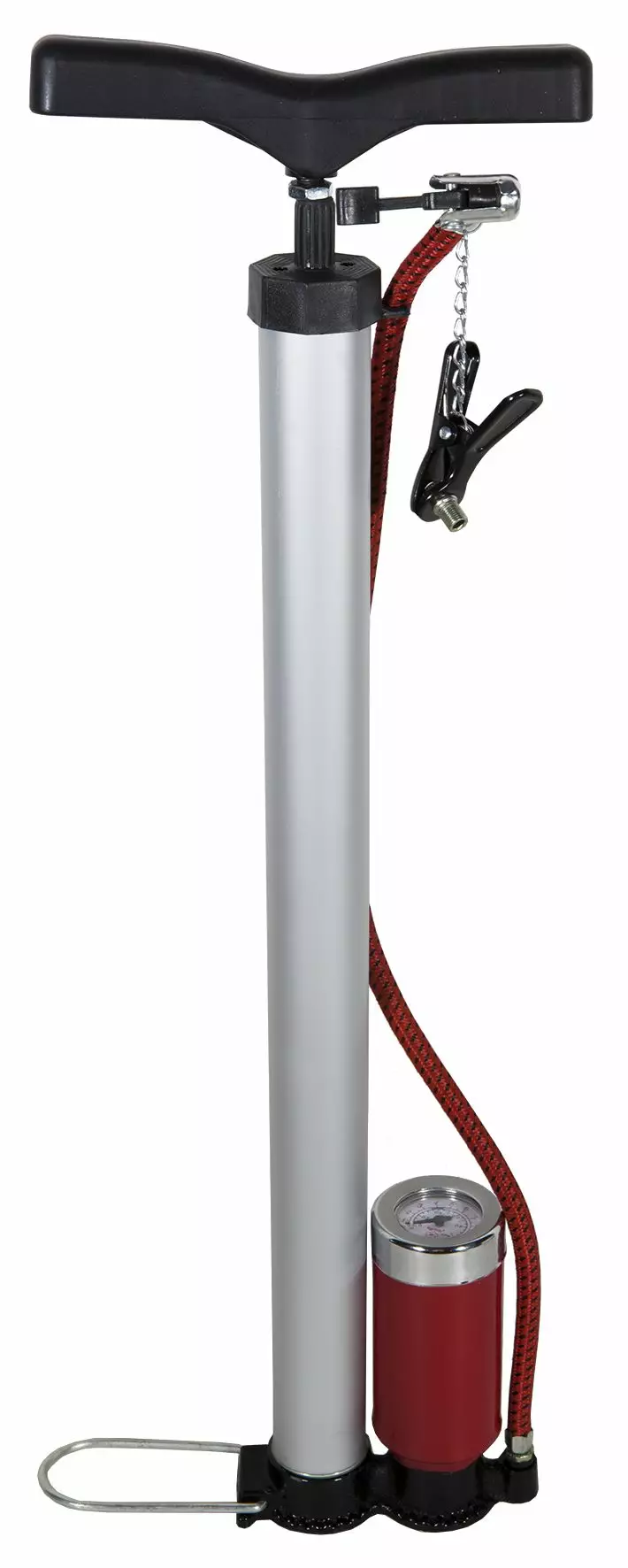 Alumiinirunkoinen ilmapumppu painemittarilla. Soveltuu maastopyörissä ja autoissa käytettyyn Schrader-venttiilille.