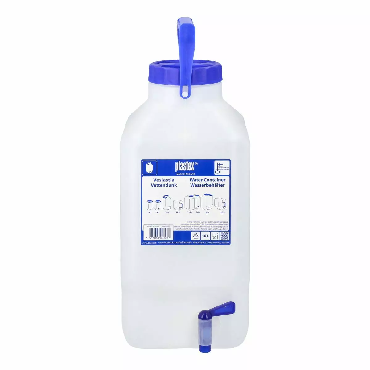 Vesiastia 10L isolla suuaukolla, kahvalla ja kääntöhanalla. Kuljetus ja säilytys pystyasennossa ja hana pitää olla pohjassa. Elintarvikekäyttöön. BPA-vapaa. Valmistettu Suomessa.
