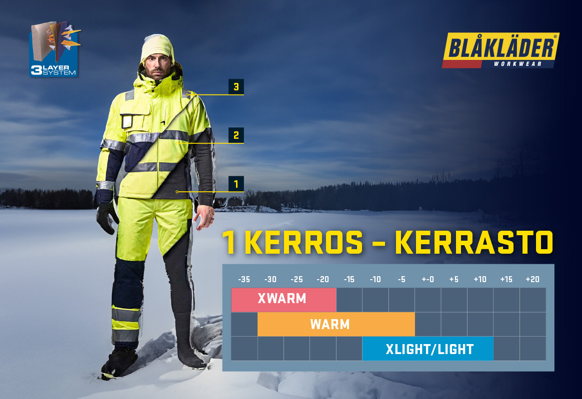Raskaissa töissä on tärkeää pysyä kuivana ja sopivan lämpimänä. Kolmikerrosperiaate mahdollistaa ruumiinlämmön säätelyn vaatteita vähentämällä tai lisäämällä sään ja työtahdin mukaan.