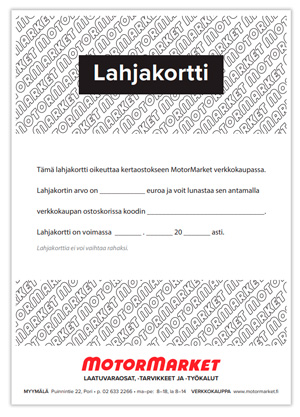 MotorMarketin verkkokaupasta ostetut lahjakortit ovat sähköisiä lahjakortteja ja lahjakortti tulee käyttää motormarketin verkkokaupassa. Tämä lahja on helppo toimittaa suoraan lahjansaajan sähköpostiin!