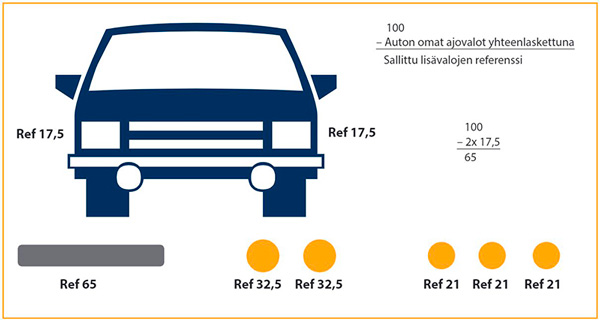 Lisävalojen valinnassa tulee ottaa huomioon auton omien valojen referenssiluvut. Kaikkien valojen yhteenlaskettu referenssiluku saa olla maksimissaan 100.