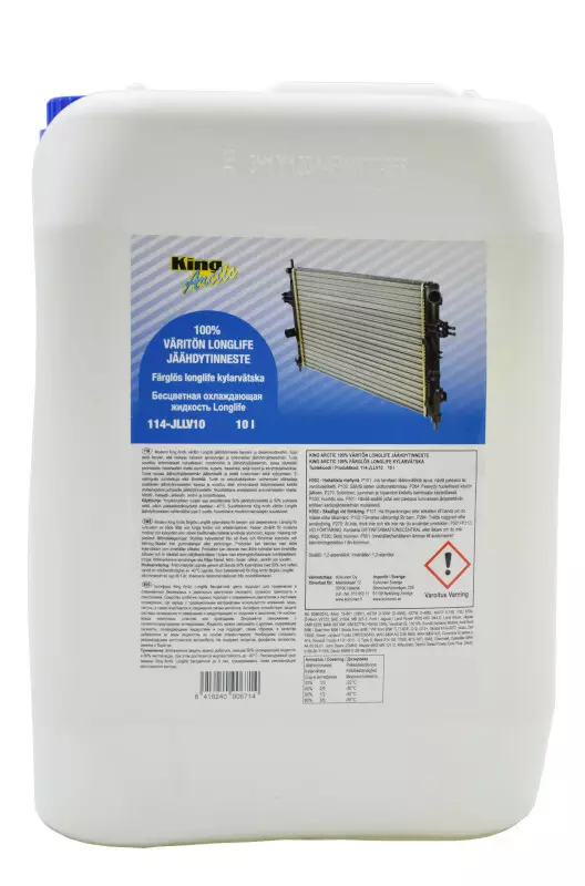 Moderni King Arctic väritön Longlife jäähdytinneste bensiini- ja dieselmoottoreihin. Sopii sekä kevyen, että raskaan kaluston ajoneuvojen ja työkoneiden jäähdytinjärjestelmiin. Tuote soveltuu erinomaisesti nykyaikaisiin moottoreihin ja jäähdytinjärjestelmiin, joissa käytetään perinteisten materiaalien ohella alumiinia, kuparia, messinkiä, sekä muovi ja kevytmetalliseoksia. Tuote suojaa jäähdytinjärjestelmän jäätymiseltä ja estää ruostumisen sekä syöpymisen. Ei vahingoita kumiletkuja eikä tiivisteitä. Tuote on sekoituskelpoinen vanhempien silikaatteja sisältävien jäähdytinnesteiden kanssa ja soveltuu siten erinomaisesti lisäysnesteeksi kaikille etyleeniglykoli-pohjaisille jäähdytinnesteille. Noudatettavaensisijaisesti autovalmistajien ohjeita. Nitriitti-, fosfaatti-, silikaatti-, amiini- ja boraattivapaa.Käyttöohje: Ympärivuotisen suojan saa sekoittamalla 50% jäähdytinnestettä ja 50% puhdasta vettä, jolloin pakkaskestävyydeksi saadaan -40°C. Suosittelemme King Arctic väritön Longlife jäähdytinnesteen vaihtoväliksi jopa 5 vuotta, huomioitava moottorinvalmistajien suositukset.