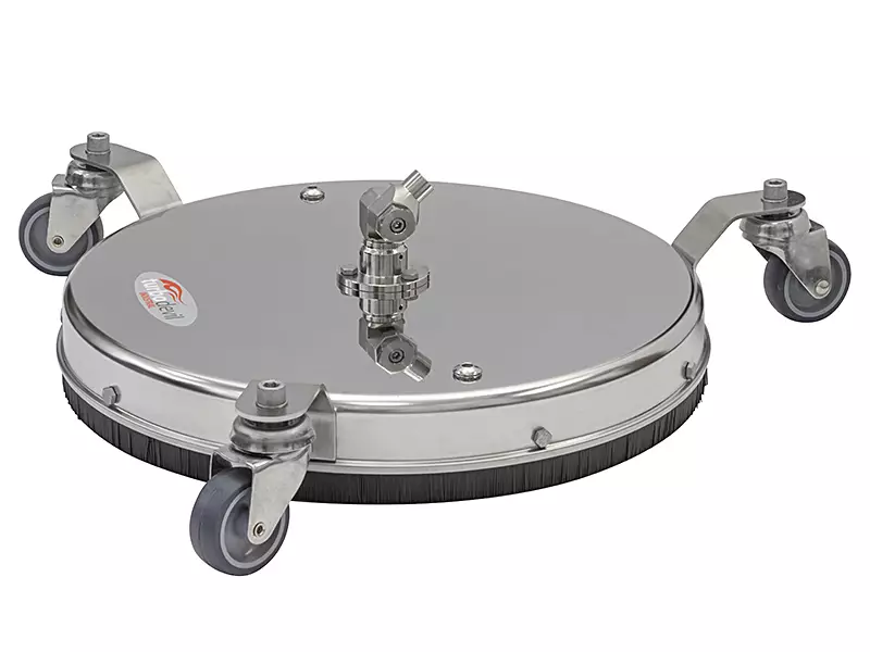 Kevyt lattiapesin pyörillä puhdistukseen teollisuusympäristöissä. Täysin ruostumaton muotoilu. Liitännät kahdelle suuttimelle.