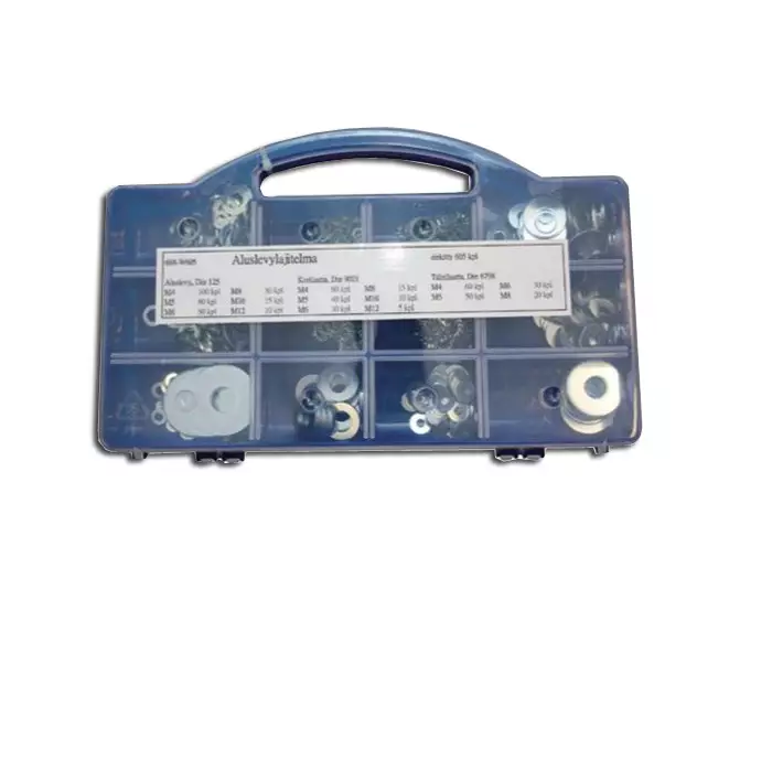 Aluslevylajitelma M4-M12 Aluslevyt, korilaatat, tähtilaatat, sinkitty. DIN125, DIN9021, DIN6798 yht. 605kpl.