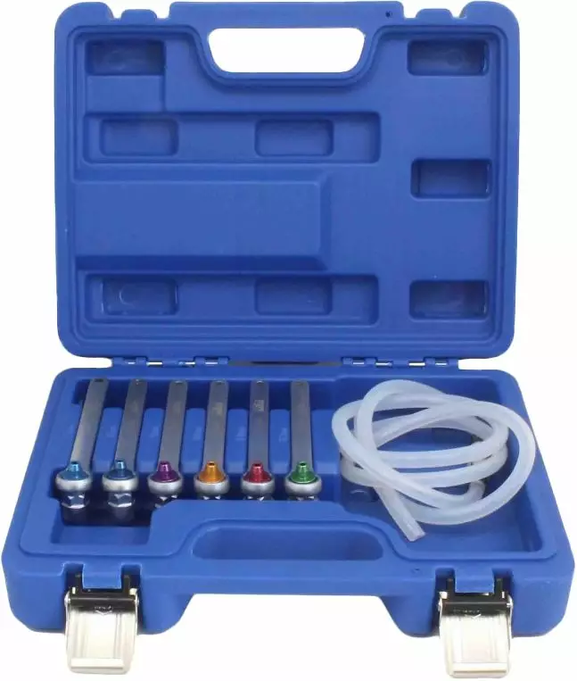 Jarrujen ilmaussarja kirkkaalla letkulla ja yksisuuntaisella venttiilillä. Sarjassa on avaimet: 7, 8, 9, 10, 11, 12mm.