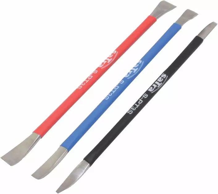 Ruostumattomasta teräksestä valmistettu verhoilunirrotustyökalusarja, jotka on tarkoitettu listojen, verhoilujen yms. purkamiseen. Varsi 6mm, koot: 3,5-5 mm (musta), 6-10 mm (sininen), 9-12 mm (punainen). Pituus: 185mm.