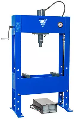 Paineilmahydraulinen puristin raskaampaan korjaamokäyttöön ja teollisuuteen.Sekä esiohjaus että puristus paineilmalla. Kaikki toiminnot suoritetaan kaksitoimisella jalkapolkimella, joka jättää molemmat kädet vapaaksi työskentelyä varten. Sivuttaissuunnassa liikuteltava puristussylinteri. 300 mm iskunpituus hankalillekin puristusoperaatioille. Katsekorkeudella oleva sisäänrakennettu painemittari. Runko ja puristuspöytä on valmistettu kestävästä teräksestä. Vinssillä toimiva puristuspöytä. Vaihdettava puristukärki. Vakiovarusteena kaksi v-alasinta.