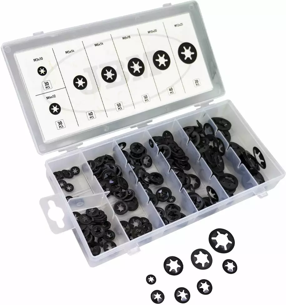 Lukituslevysarja sisältää koot: M3x10 (30 kpl), M4x12 (30 kpl), M5x14 (40 kpl), M6x14 (50 kpl), M8x18 (50 kpl), M10x20 (40 kpl), M12x25 (20 kpl).