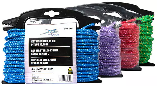 Punottu polypropeeniköysi. Neljä eri väriä (2x4kpl). Koko 4,76 mm, pituus 30,48 m.Vetolujuus 300 lbs (136 kg). Paino 244 g. Toimitetaan kahvallisessa kelassa, jonka saa myymäläpiikkiin roikkumaan.
