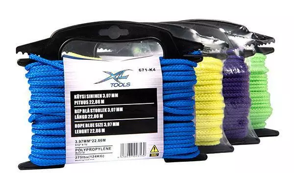 Punottu polypropeeniköysi - Neljä eri väriä - Halkaisija 3,97 mm - Pituus 22,86 m - Vetolujuus 275 lbs (124 kg) - Paino 0,22 kg/kpl