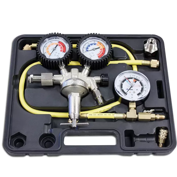 Sisältää: Typen paineensäädin, 48" keltainen täyttöletku, vuodonilmaisinadapteri, R410a suora adapteri 1/4" uros x 5/16 kääntyvä naaras. Mastercoolin typen paineensäädin on suunniteltu erityisesti auton ilmastointijärjestelmiä varten. Tätä yksivaiheista typen paineensäädintä käytetään järjestelmien vuodonetsintään, kun niissä ei ole kylmäainetta.