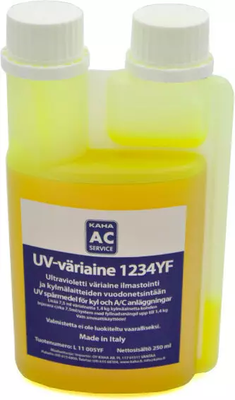 UV-väriaine ilmastoinnin vuodon etsintään UV-väriaine HFO-1234yf 250 ml mittapullossa, josta öljyä on helppo annostella.