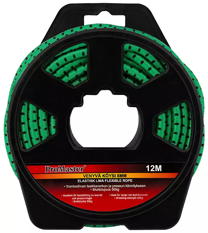 -ihanteellinen taakkaverkon ja pressun kiinnitykseen -köyden: --pakuus 8 mm --pituus 12 m -murtolujuus 50 kg