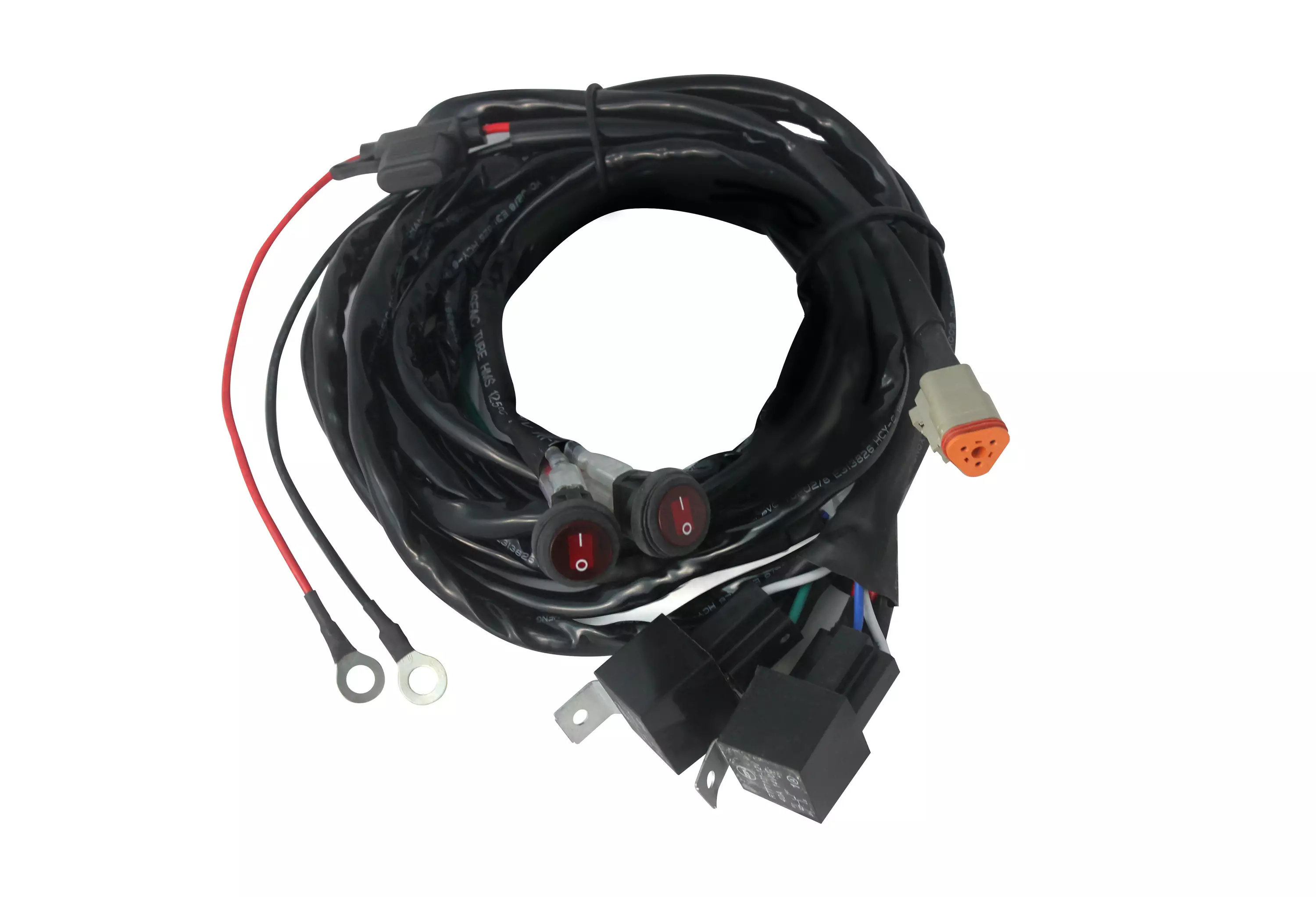 Johtosarja työvalolle ja varoitusvalolle tms. I-O-II kytkimellä ja kahdella releellä, 3DT-liitin valolle.