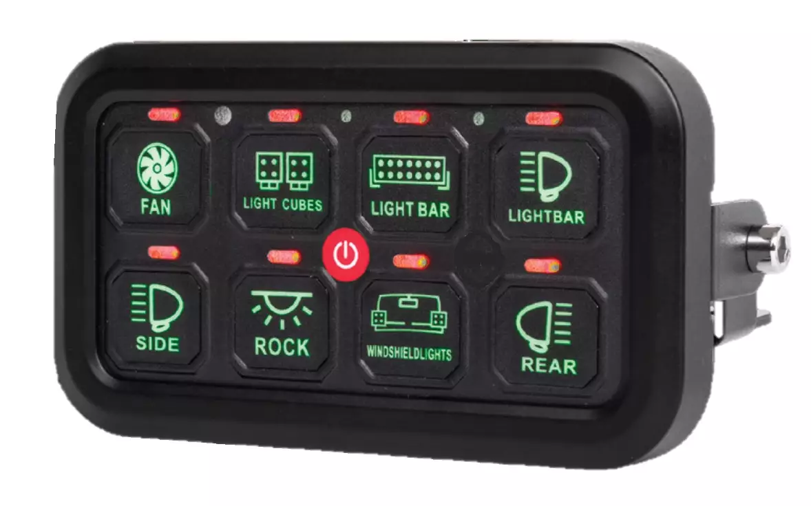 Erittäin monipuolinen kytkinpaneeli, jopa kahdeksan sähkölaitteen kytkentään. Kytkinpaneelin avulla kytket erilaiset työvalot, varoitusvalot ja puhaltimet samaan paneeliin.