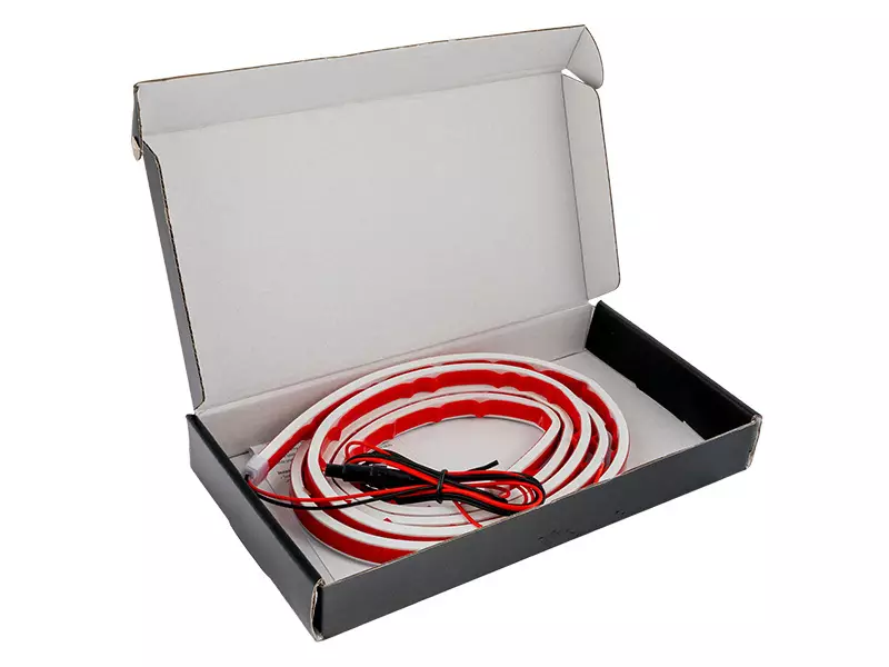 Näyttävä valkoinen valonauha konepellin etureunaan, tarrakiinnitys, mahdollisuus lyhentää pituus sopivaksi muutaman sentin välein, pituus 180cm, jännite 11-15V.