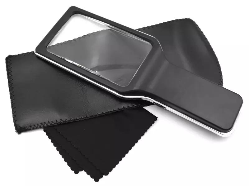 Kätevä suurennuslasi pienien merkintöjen tarkasteluun. Varustettu LED-taustavalolla. Lasi valmistettu heijastamattomasta akryylista (PMMA). Suurennus 300%. Pakkauksessa mukana pussi säilytystä varten ja puhdistussliina. Toimii kolmella AAA paristolla (ei kuulu mukaan).