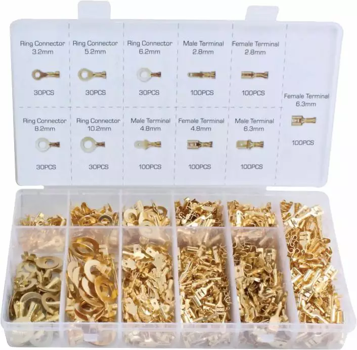 Monisäikeisille johdoille tarkoitetut liittimet takaavat kestävän ja lujan liitoksen. Sisältää: uros ja naaras laattaliittimet 2.8-6.3mm, rengasliittimet 3,2-10.2mm.