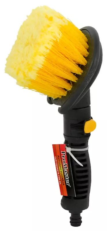 -pitävä kahva -irrotettava harjapää (3/4" sisäkierre) -pehmeä harjas -vesiliitäntä standardipikaliittimelle -veden katkaisupainike