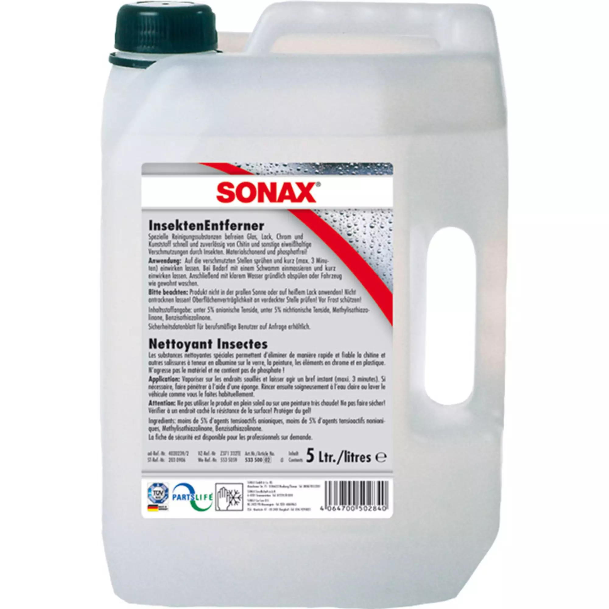Erikoispuhdistusaine, joka puhdistaa nopeasti ja tehokkaasti kitiiniä ja muita proteiinejä sisältävät kuolleiden hyönteisten jäämät auton maali-, lasi- ja muovipinnoilta. Hellävarainen, ei vahingoita muoviosia. Ei sisällä Fosfaattia.