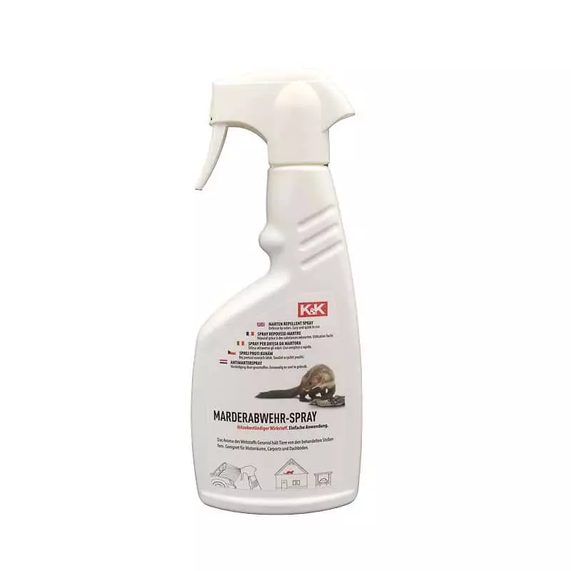 K&K Marten Repellent Spray on tehokas ja helppokäyttöinen karkotesuihke näätäeläimiä sekä muita pieniä nisäkkäitä vastaan. Tuote on suunniteltu suojaamaan erityisesti ajoneuvojen moottoritiloja, mutta soveltuu myös käytettäväksi autokatoksissa, ullakoilla ja muissa riskialueissa, joissa jyrsijät ja näätäeläimet voivat aiheuttaa vahinkoa.