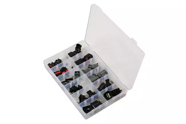 - Sisältää liittimet osanumeroina: Monikäyttöinen 2-napainen liitin (Osanumero 37601) x 2, Monikäyttöinen 2-napainen liitin (Osanumero 37603) x 2, Monikäyttöinen 2-napainen liitin (Osanumero 37605) x 2, Monikäyttöinen 2-napainen liitin (Osanumero 37606) x 2, Nokka-akselianturiliitin (Osanumero 37607) x 2, Nokka-akselianturiliitin (Osanumero 37608) x 2, Nokka-akselianturiliitin (Osanumero 37430) x 2, Polttoaineenpaineen liitin (Osanumero 37609) x 2, Monikäyttöinen pistorasian kotelo (Osanumero 37610) x 2, Ajovalon H7-lampun liitin (Osanumero 37612) x 2, Ilmamääräanturiliitin (Osanumero 37614) x 2, Ohjaustehostinpumpun liitin (Osanumero 37615) x 2.