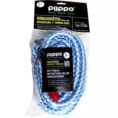 Auton hinausköysi, pituus 6m, halkaisija 18mm, lujuus 2500kg. Kätevä liittää hinattavaan autoon lukituslenkin ansiosta.