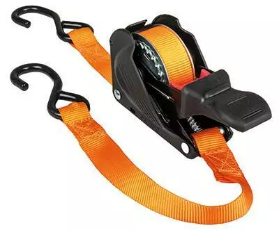 Jousitettu kelausmekanismi. 2 kestävää kiinnityskoukkua. Kiristyslujuus 250 kg, murtolujuus 500 kg. Nauhan leveys 25 mm, pituus 3 m.