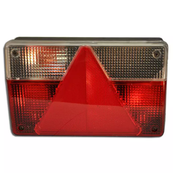 Takaääri-, jarru-, vilkku-, sumu- ja rekisterivalo sekä heijastinkolmio. Vasen.
