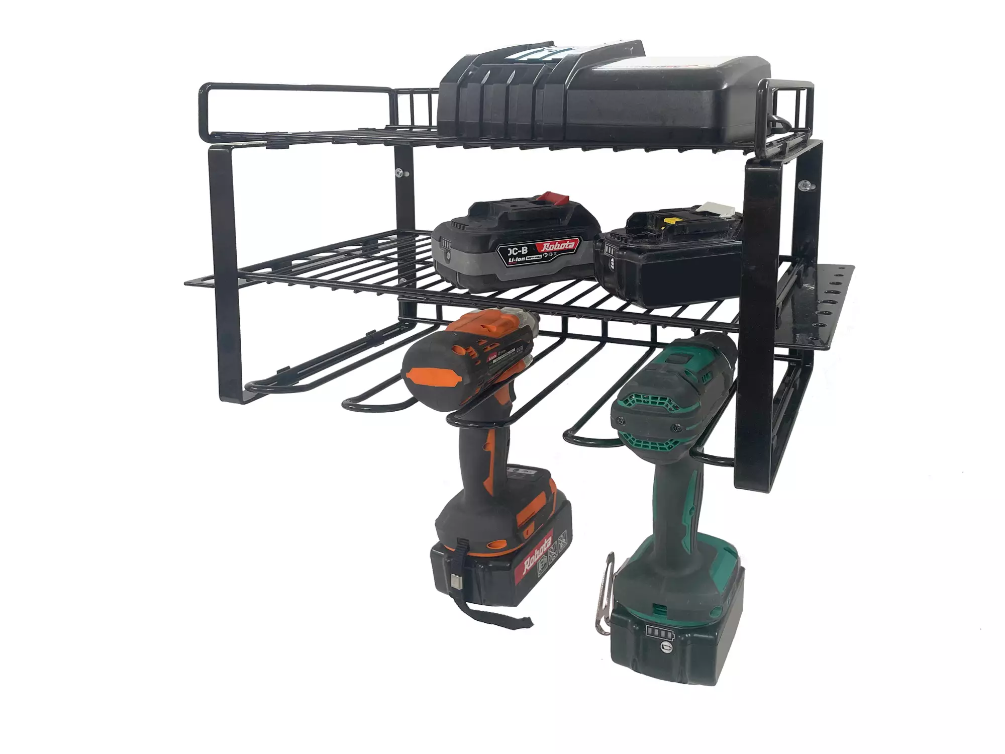 Robotan akkuporakone telineessä porakoneiden ja niiden akkujen säilyttäminen käy kätevästi ja siististi. Hyllyssä on kolme kerrosa, alimpaan porakoneet sopivat näppärästi ja kahteen ylimpään menee akut ja muita tarvittavia välineitä. Hyllyn asentaminen seinälle onnistuu neljän ruuvin avulla.