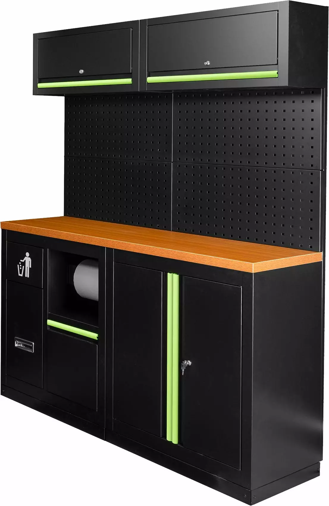 Työasemakokoonpano puutasolla. Kokoonpanossa on roskakori, paperiteline, alakaappi pariovilla ja yläkaapit. Mitat: 1360x500x1950mm.