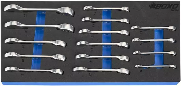 Kiintolenkkiavainsarja Lyhyet 8-22mm Boxo Vaunuun 15-Osainen sarja sisältää erikoislyhyet kiintolenkkiavaimet: 8, 9, 10, 11, 12, 13, 14, 15, 16, 17, 18, 19, 20, 21, 22 mm Vaahtomuovimoduulin koko... Lue lisää