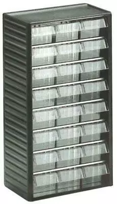 24 kpl pikkulaatikoita. Tukeva harmaa polypropeenirunko. Laatikostot voidaan pinota päällekkäin tai ripustaa seinälle. Laatikot lasinkirkasta polystyreeniä. Laatikoissa mukana etiketit Kotimainen... Lue lisää
