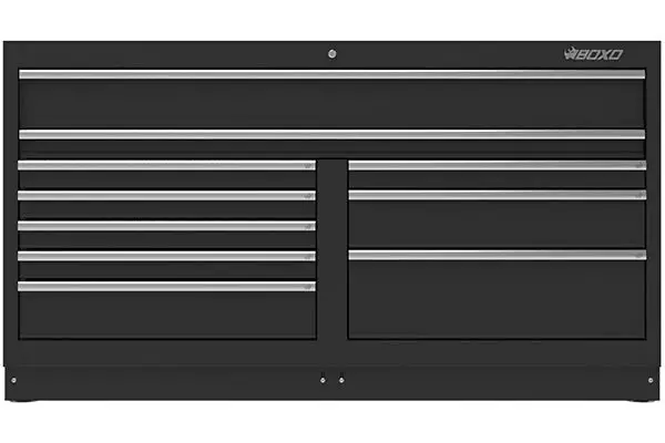 Erikoisleveä vetolaatikosto Boxon OSM-kalustekokonaisuuksiin. Kahden ylimmän vetolaatikon leveys on peräti 1636 mm. Alempiin vetolaatikoihin mahtuu neljä työkalumoduulia. Huom! Kokonaisleveys on 1722 mm, eli kaappi on kaksi kertaa muita alakaappeja leveämpi. Vetolaatikoiden koot (L x S x K): - 1 kpl: 1636 x 397 x 152 mm - 1 kpl: 1636 x 397 x 72 mm - 5 kpl: 775 x 397 x 72 mm - 2 kpl: 775 x 397 x 152 mm - 1 kpl: 775 x 397 x 233 mm Yhden vetolaatikon kantavuus 40 kg.