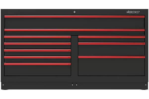Erikoisleveä vetolaatikosto Boxon OSM-kalustekokonaisuuksiin. Kahden ylimmän vetolaatikon leveys on peräti 1636 mm. Alempiin vetolaatikoihin mahtuu neljä työkalumoduulia. Huom! Kokonaisleveys on 1722 mm, eli kaappi on kaksi kertaa muita alakaappeja leveämpi. Vetolaatikoiden koot (L x S x K): - 1 kpl: 1636 x 397 x 152 mm - 1 kpl: 1636 x 397 x 72 mm - 5 kpl: 775 x 397 x 72 mm - 2 kpl: 775 x 397 x 152 mm - 1 kpl: 775 x 397 x 233 mm Yhden vetolaatikon kantavuus 40 kg.
