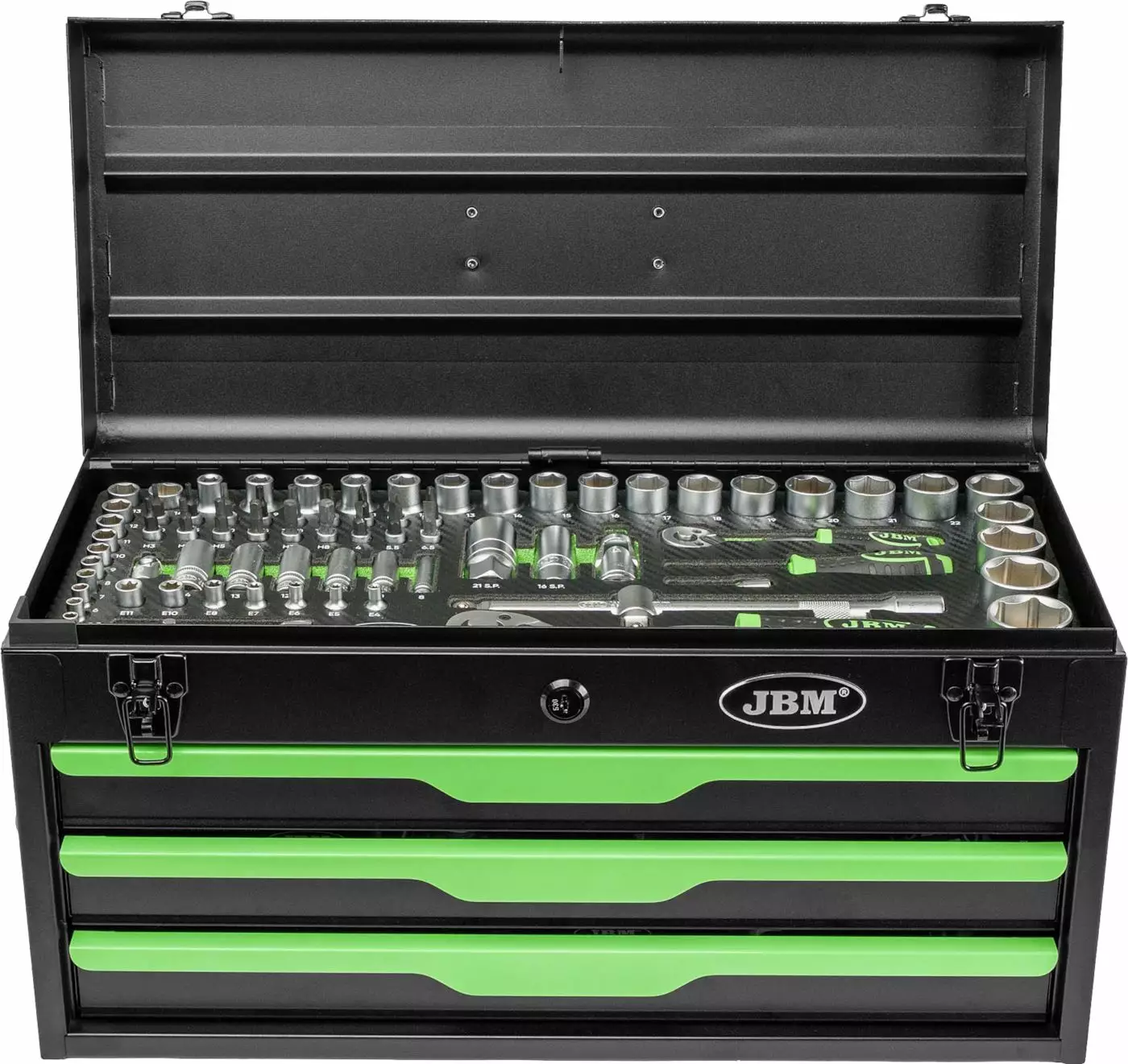 Metallinen työkalulaatikko työkaluilla, 143 osaa. Työkalulaatikossa on kolme vetolaatikkoa ja päällä kannellinen laatikko jotka on lukittavissa. Sopii erinomaisesti huoltoautoihin yms. metallirungon ja vetolaatikoiden ansiosta.