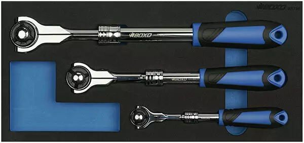 Kolmiosainen sarja sisältää 1/4", 3/8" ja 1/2" räikkäakselistaan nivelletyt teleskooppiräikkävääntimet. Pituudet vääntiöittäin: 1/4": 200-250 mm 3/8": 290-390 mm 1/2": 360-500 mm Vaahtomuovimoduulin koko 185 x 393 mm