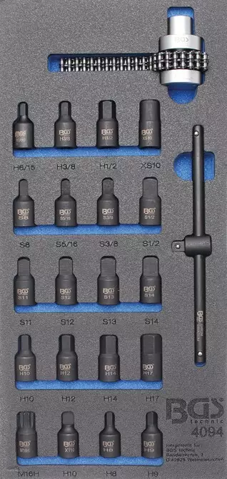 Kuusiokolohylsyt: 8 - 9 - 10 - 12 - 14 - 17 mm, 5/16", 10 mm (3/8"), 12.5 mm (1/2")