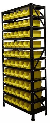 Ruuviteline, jossa musta teräsrunko ja 60 keltaista muovilaatikkoa.Jokaista laatikkoa kohden toimitetaan yksi välilevy, jolla laatikon saa jaettua kahteen osaan. Telineessä on siis paikka jopa 120 erilaiselle tuotteelle. Jokaisen hyllylevyn reunassa on korotettu osa, joka estää laatikoiden liikkumisen reunan yli. Laatikon kantavuus 1 kg. Telineessä on yht. 12 kulmittaista tukipalaa, joten se on erittäin tukeva. Telineen jalkojen alle laitettavatkumitassut vähentävät lattian kulumista.