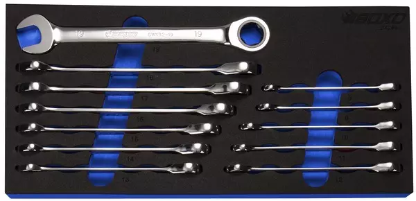 Sisältää avainkoot 8, 9, 10, 11, 12, 13, 14, 15, 16, 17, 18, 19 mm
