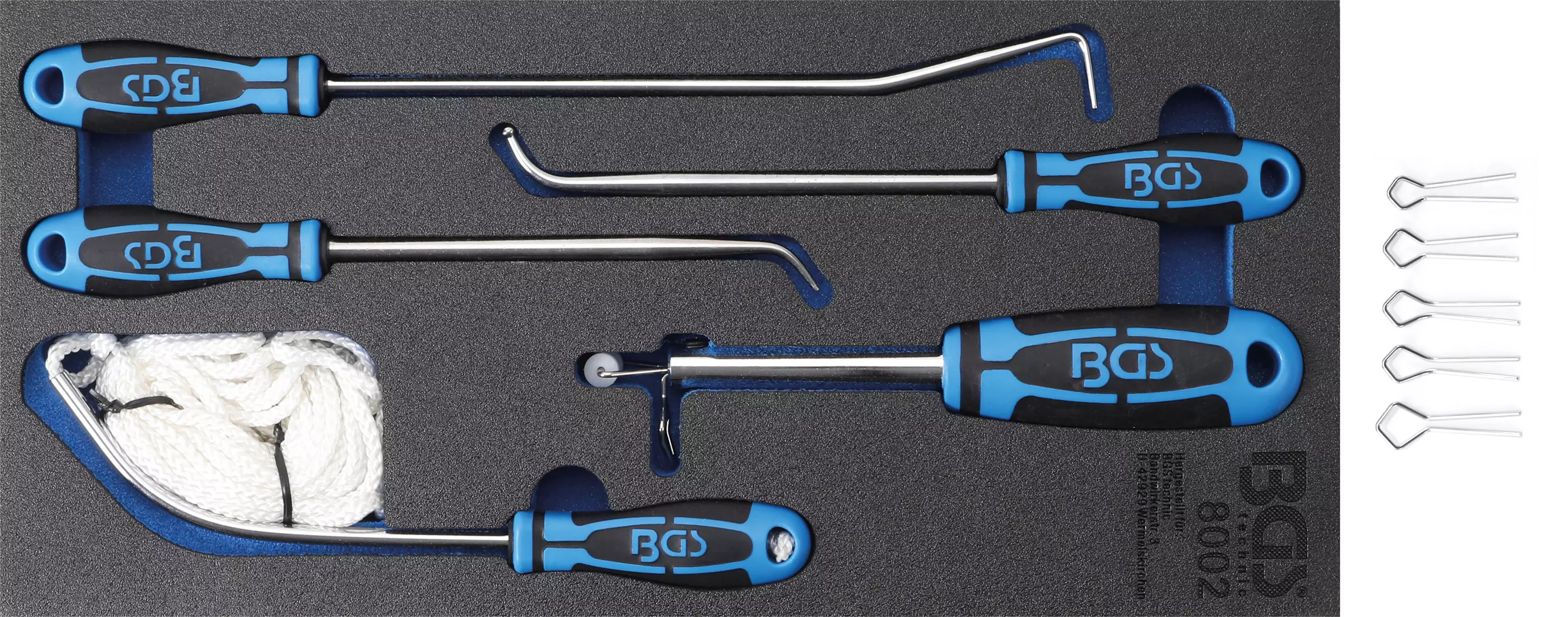 1 x koukku pallopäällä: 210 mm 1 x koukku: 45°, 210 mm 1 x koukku: 270 mm 1 x narunasennustyökalu 1 x asnnusnaru: 6,0 m SOPII MYÖS KAMASAN TYÖKALUVAUNUUN