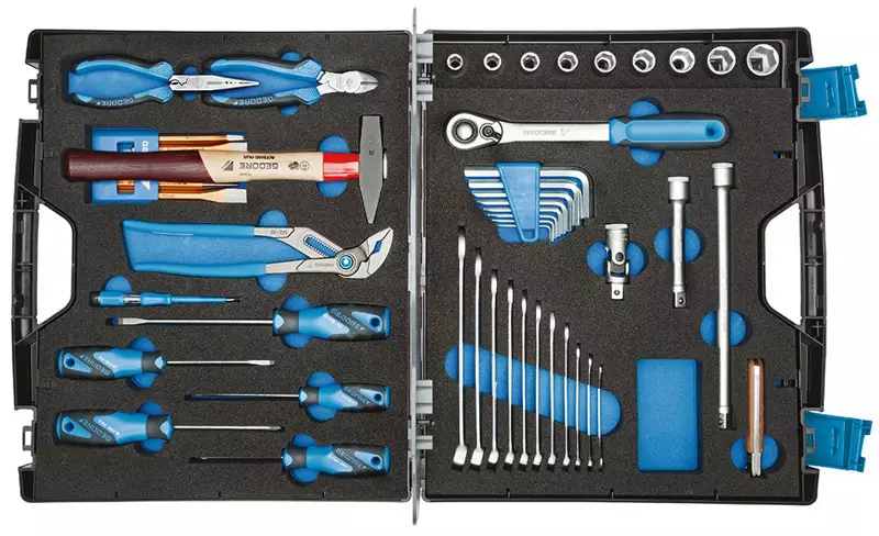 Korkeimmat laatuvaatimukset täyttävä 49 osainen työkalusarja käytännöllisessä ja tukevassa muovisalkussa. Työkalulaukussa vaahtomuovialusta, jolla työkalut pysyvät siististi paikoillaan kuljetuksen aikana. Tämä Gedore Touring-salkku on oiva kumppani liikkuvan ihmisen tarpeisiin -kaikki tarvittavat työkalut kulkevat mukanasi selkeästi järjestettyinä.