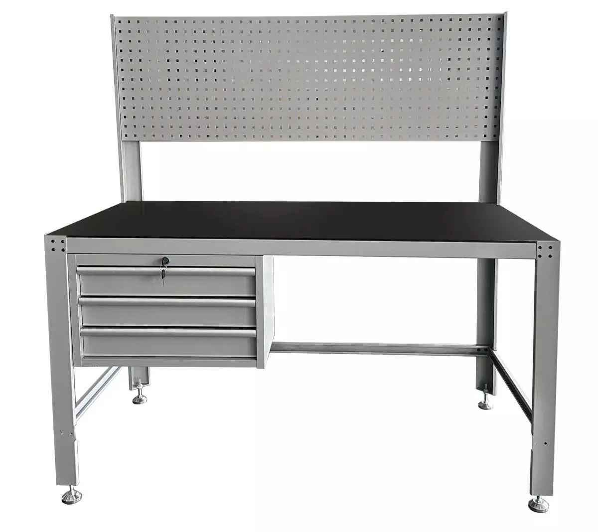 Tukeva työpöytä reikälevytaustalla ja lukittavalla kuulalaakeroidulla vetolaatikostolla. Kannessa PE-suojalevy ja vetolaatikoiden pohjissa pehmustelevyt. Reikälevytaustan reikäjako on yleisimmin käytetty 38 mm, joka on yhteensopiva esim. Sovella-kannattimien kanssa. Jauhemaalattu pinta suojaa naarmuuntumiselta ja antaa pöydälle tyylikkäästi viimeistellyn ilmeen. Jaloissa korkeudensäätö, säätövara 60 mm. Pöydän kokonaiskantavuus 1000 kg.