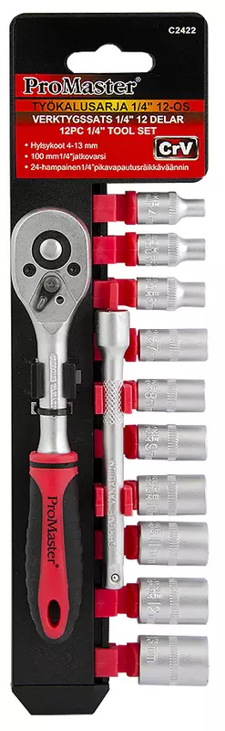 ProMaster -Korkealaatuista kromi-vanadiini terästä -Sisältää: --10 kpl 1/4" 6 kulmaista hylsyä: 4-13 mm --1 kpl 1/4" jatkovarsi 100 mm --1 kpl 1/4" 24-hampainen räikkä -Hieno satiinipinta... Lue lisää