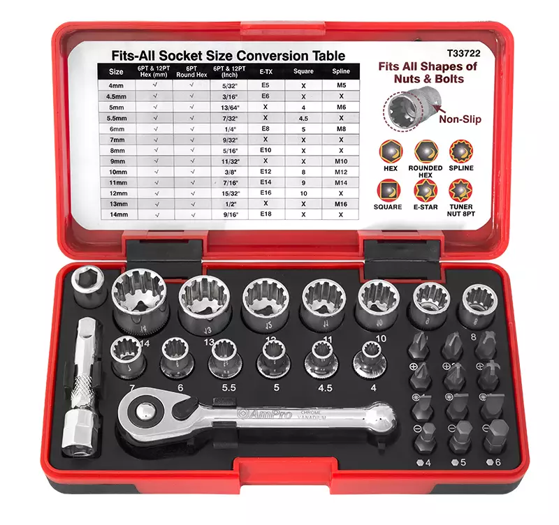 AmPro -Korkealaatuista kromi-vanadiini ja S2-terästä -Sisältää: --13 kpl 1/4" fits-all hylsyä, sopii 6-kulmaisiin,8-kulmaisiin ja 12-kulmaisiin: 4,4.5,5,5.5,6,7,8,9,10,11,12,13,14 mm... Lue lisää